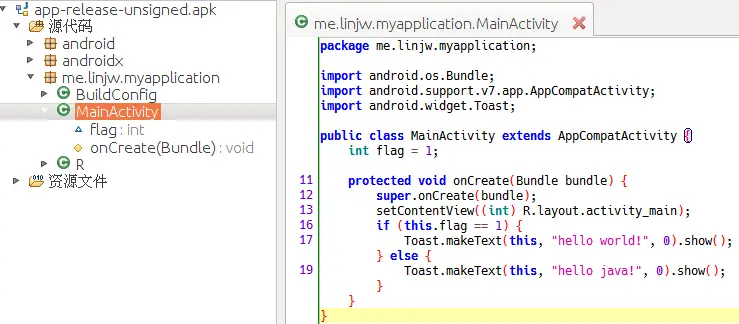 我这里反编译了一个demo应用,它的MainActivity.onCreate里面判断了一个flag变量,然后弹出Toast.