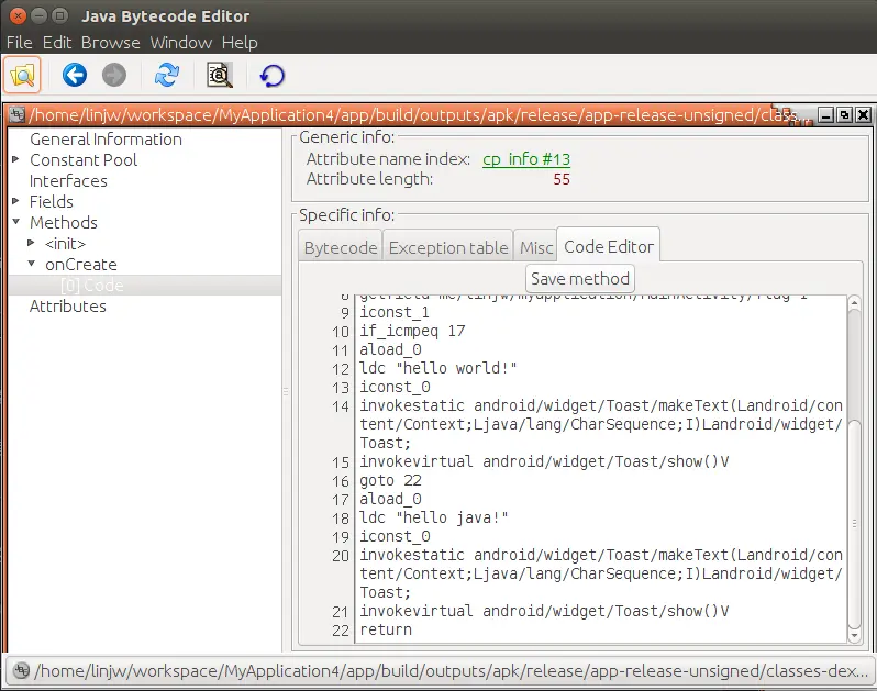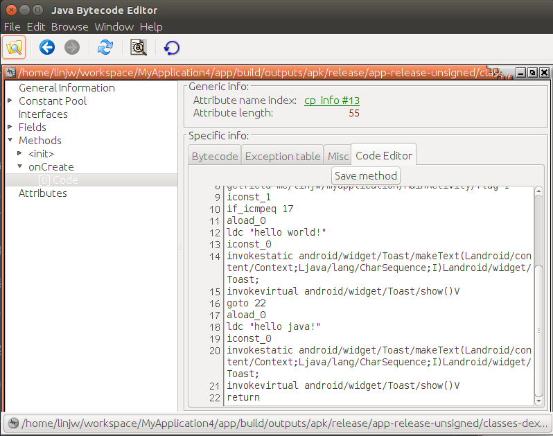 然后点击Code Editor选项就可以对字节码进行修改了,这里我们将if_icmpne改成if_icmpeq,然后点击Save method: