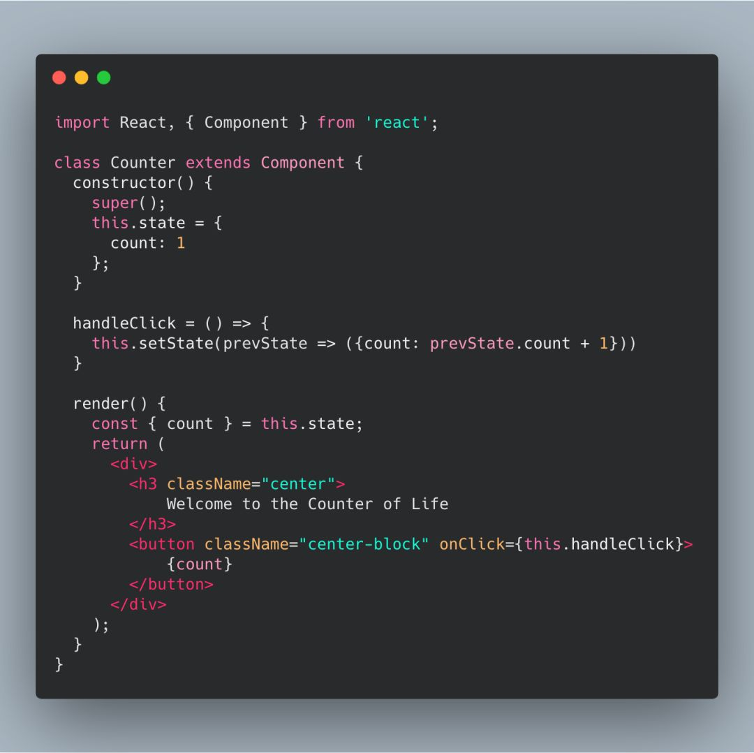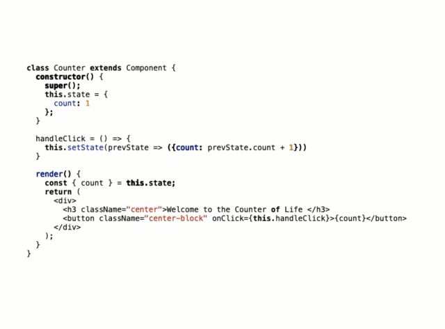 再者,我们注意到在重构后的 handleClick 函数中,更新 state 时并不需要 prevState 或保存 prevState 的引用。 直接在调用 setCount 时传入新的值 count + 1 即可(你也可以在给 setCount 传入一个函数,但这一般只建议在 class component 的 setState 中使用,举个栗子:setCount(prevCount => prevCount + 1))。