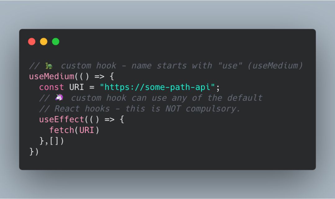 要明白一点,Custom Hooks 只不过就是一个常规的 Function 而已,但是它的名称必须以 use 开头。 另外,如果需要的话,我们也可以在 Custom Hooks 内调用 React Hooks。