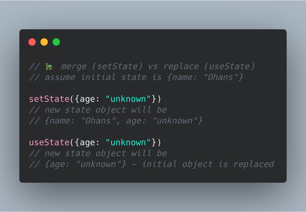 在 Class Component 中,不论有一个 state 或多个 state,我们都会将其定义在一个对象中。 但是对于 useState,这就有些不同了。