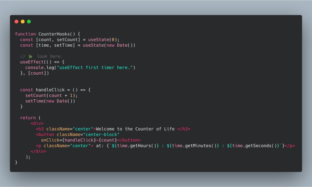 在上面的栗子中,我们直接将变量传入 useState,而不是将其定义在一个对象内。如果现在需要另一个 state 变量呢? 就比如下面的这个组件,新加了一个展示当前点击时间的功能。