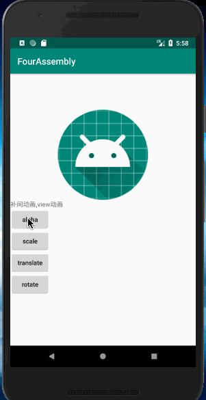 - android:pivotY 缩放起点Y轴坐标,可以是数值、百分数、百分数p 三种样式,比如 50、50%、50%p