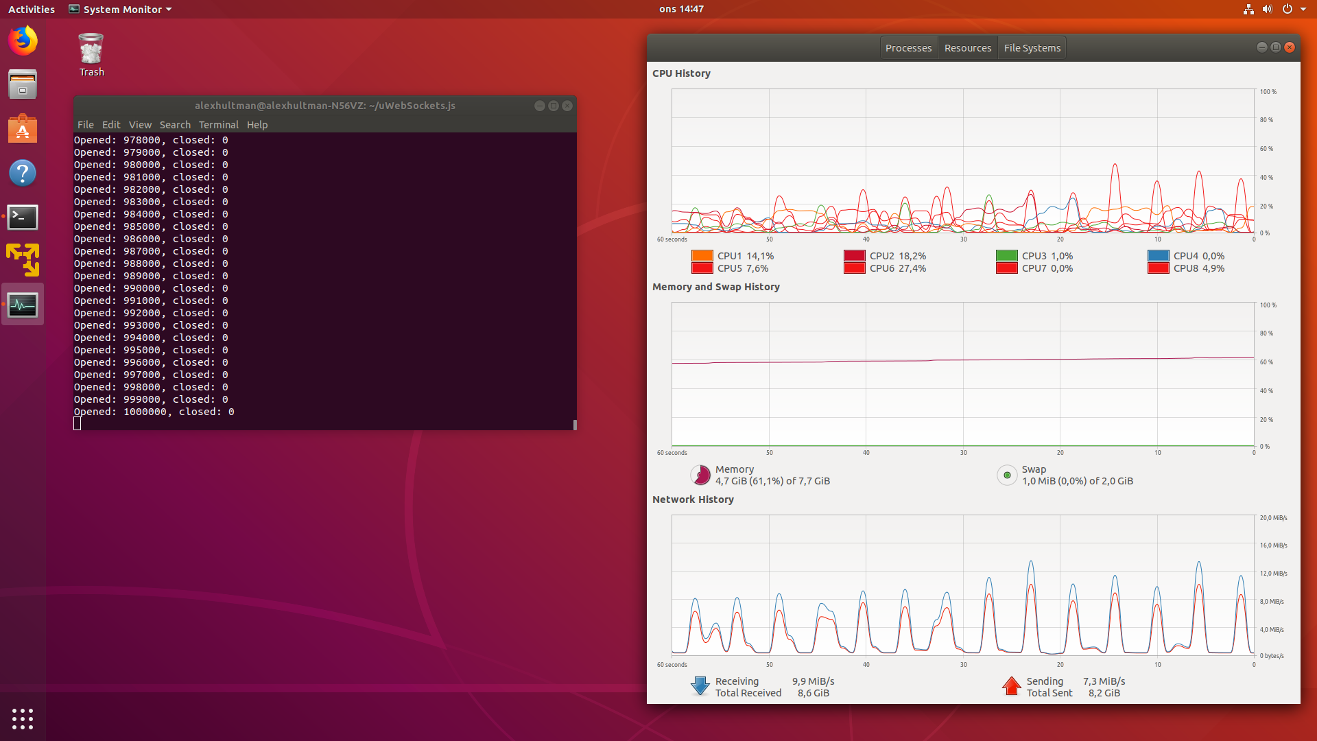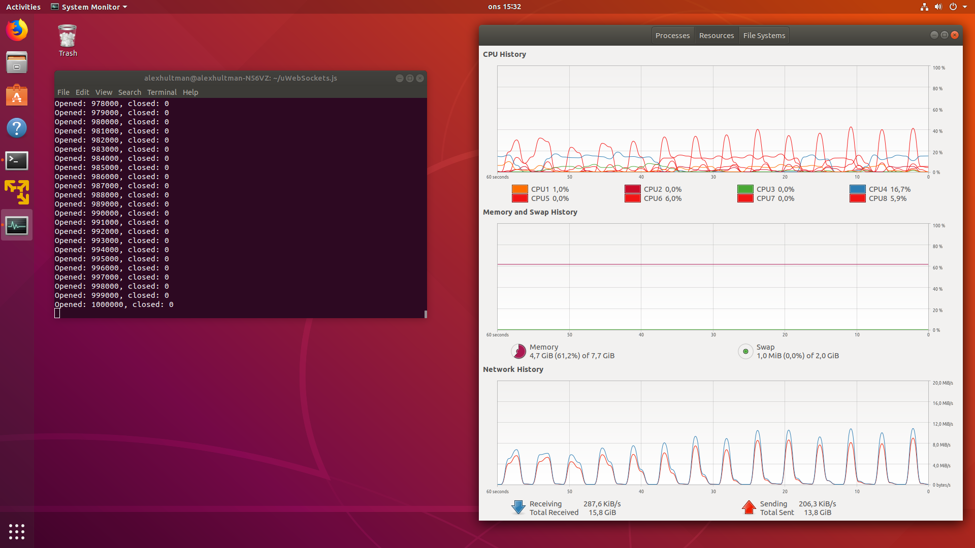 每项都是稳定良好运行。事实上,我在运行服务的笔记本上写着本文,并且被关闭的 socket 连接数量始终为 0,同时系统也是响应及时的。甚至我开启一个简单的游戏的情况下服务还能让连接继续。