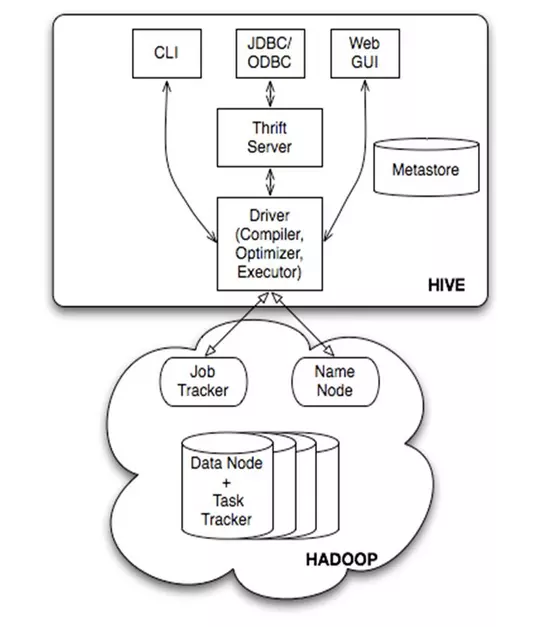 由上图可知,hadoop和mapreduce是hive架构的根基。Hive架构包括如下组件:CLI(command line interface)、JDBC/ODBC、Thrift Server、WEB GUI、metastore和Driver(Complier、Optimizer和Executor)。
