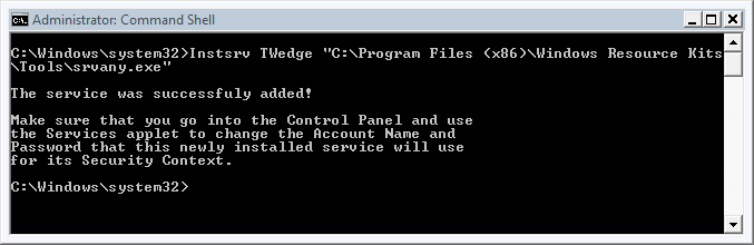 - 打开命令行(Start -> Run -> “cmd”),转到Windows Resource Toolkit的安装目录并输入以下命令: Instsrv TWedge "C:\Program Files (x86)\Windows Resource Kits\Tools\srvany.exe"。