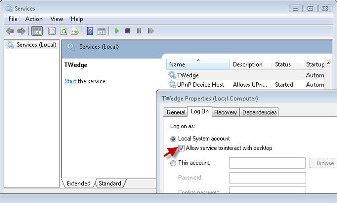 解决方案:您可以尝试“ 允许服务与桌面交互 ”选项有所不同,但如果TWedge作为服务运行,通常您无法使用键击模拟。