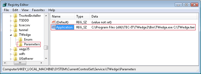 - 现在添加一个名为“Application”的“Parameters”键。它包含TWedge可执行文件的路径(默认值:C:\ Program Files(x86)\ TEC-IT \ TWedge2 \ Bin \ TWedge.exe C:\ TWedge.twi)。该twedge.twi文件打开TWedge使用预定义设置!