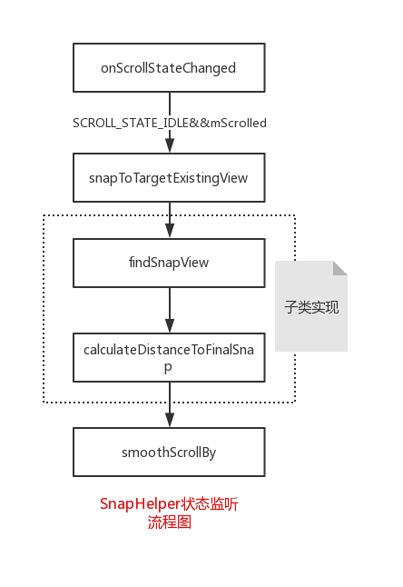 SnapHelper在attachToRecyclerView方法中注册了滚动状态和fling的监听,当监听触发时,如何处理后续的流程,我们先分析滚动状态的回调: