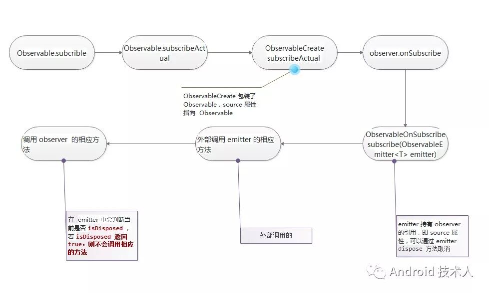 Observable subcrible > Observable subscribeActual > ObservableCreate subscribeActual > observer.onSubscribe > ObservableOnSubscribe subscribe(@NonNull ObservableEmitter emitter)(emitter 是 CreateEmitter 的实例,包装了 observer,调用 emitter 的相应方法 ,会进而调用 observer 的 onNext onError 方法,而不会调用 onComplete 方法 )