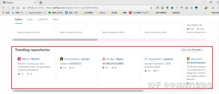 它里面有一个功能是能够显示最近比较火热的开源项目(如下图)。如果我们想看一下最近哪些仓库、技术或编程语言等比较流行,可以到这里查看一下。但有时没带电脑或就是想用碎片时间浏览一下,这时我们的小程序就派上用场了。