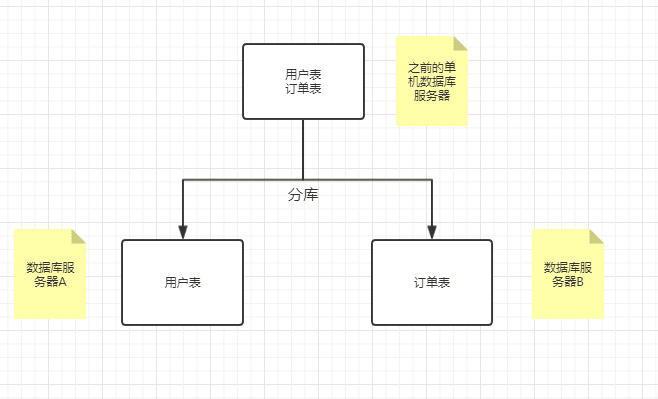 分库讲白了就是比如现在你有一个数据库服务器,数据库中有两张表分别是用户表和订单表。如果要分库的话现在你需要买两台机子,搞两个数据库分别放在两台机子上,并且一个数据库放用户表,一个数据库放订单表