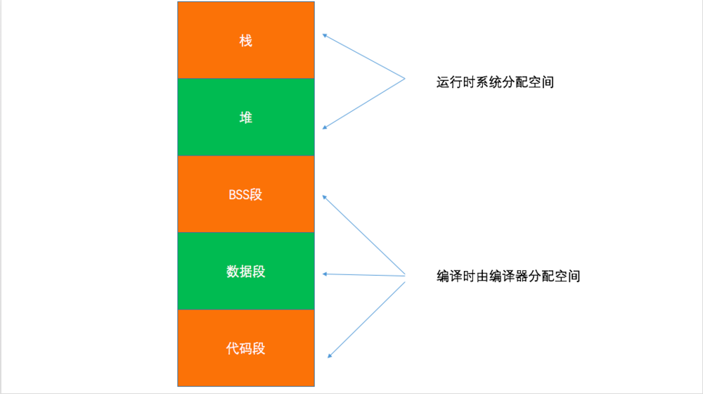 其中代码段、数据段、BSS 段在编译时由编译器分配空间,而堆和栈是在程序运行时系统分配的空间。
