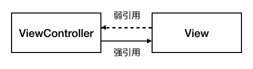 弱引用并不持有对象,也就不会增加引用计数,这样就避免了循环引用的产生。在 iOS 开发中,最常见的弱引用就是 delegate。举个例子来说,ViewController 持有某个 View, 同时 View 的一些点击事件需要通过 delegate 的方式交给 VC 来处理。这个时候,View 的 delegate 成员变量通常是一个弱引用,以避免相互引用对方造成循环应用的问题。