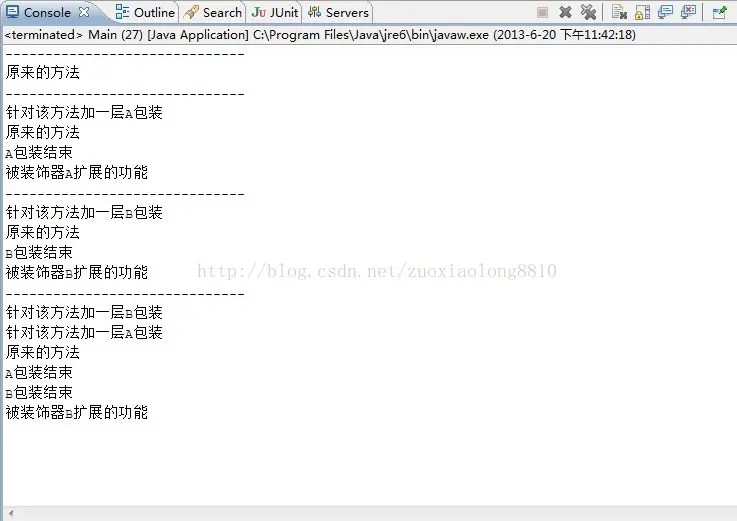 从此可以看到,我们首先是使用的原始的类的方法,然后分别让A和B装饰完以后再调用,最后我们将两个装饰器一起使用,再调用该接口定义的方法。