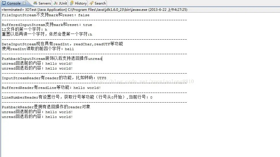 其它的IO装饰器各位可以自行尝试或者和上述的标准的装饰器模式代码比对一下,下面另附LZ的IO装饰器程序运行后结果。