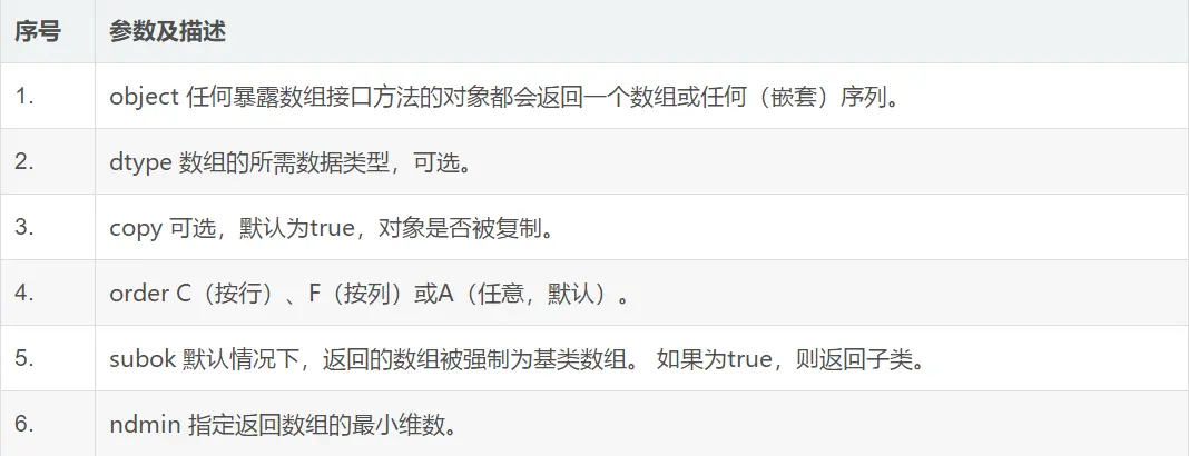 numpy.array(object, dtype = None, copy = True, order = None, subok = False, ndmin = 0)