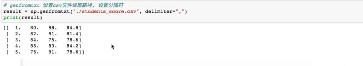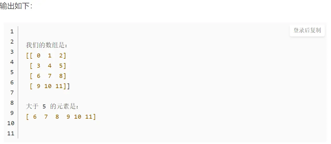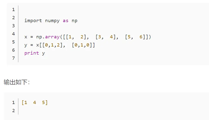 以下示例获取了ndarray对象中每一行指定列的一个元素。 因此,行索引包含所有行号,列索引指定要选择的元素。