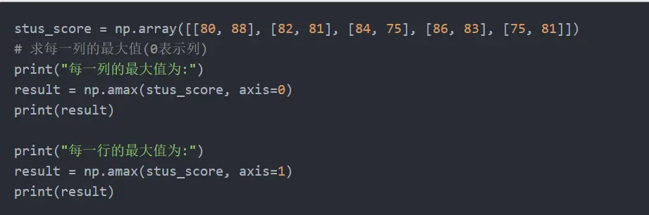 amax(参数1: 数组; 参数2: axis=0/1; 0表示列1表示行)
