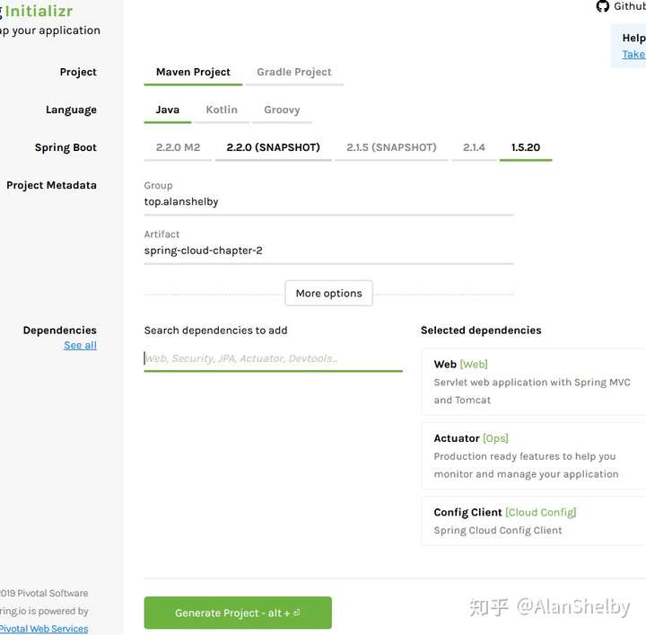 今天我们一起学习一下 Bootstrap 配置的相关知识,在学习目标中我已经列出了今天需要学习的知识点,第一个知识点为复习知识点,属于 Spring Boot 中的知识,这里我们既然讲到了配置文件,就顺便把 Spring Boot 支持的两种配置文件类型的相关知识复习一下,有助于我们对 Bootstrap 配置的学习。 首先我们先创建项目:打开 start.spring.io/,填写相关信息,添加 Web、Actuator 以及 Cloud Bootstrap 依赖,点击 “Generate Project” 按钮生成项目,并导入到 idea 中。(注:此处使用的 Spring Boot 版本为 1.X 系列)