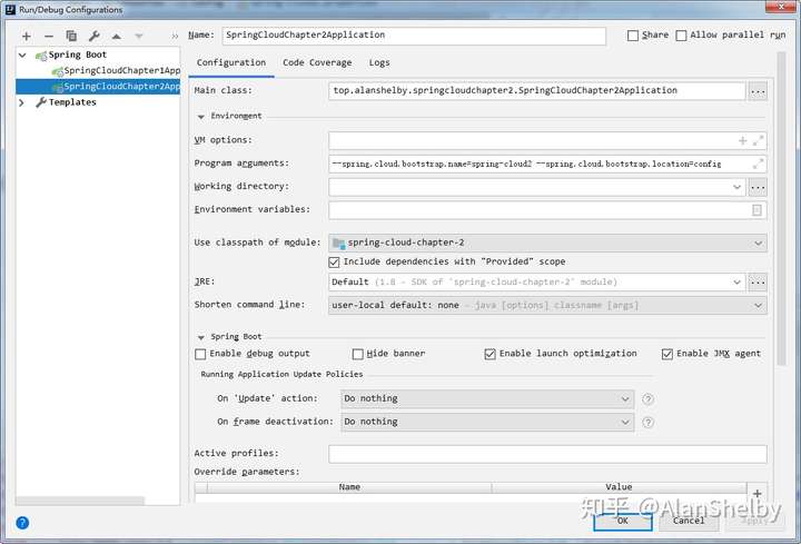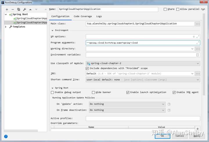 由于 Spring Cloud 的默认配置文件为 bootstrap.properties,那如果我们想要修改配置文件的名称应该如何做呢?这里我们使用调整程序启动参数的方式来进行修改。 首先我们在 Idea 中添加如下程序启动参数: