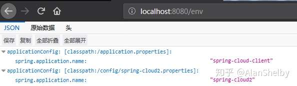 其中 application.properties(ConfigFileApplicationListener 被加载了)和 spring-cloud.properties 读取了,这是我们所期望的。 重启项目,在 http://localhost:8080/env 中查看结果,结果也是和我们所期望的是相同的: