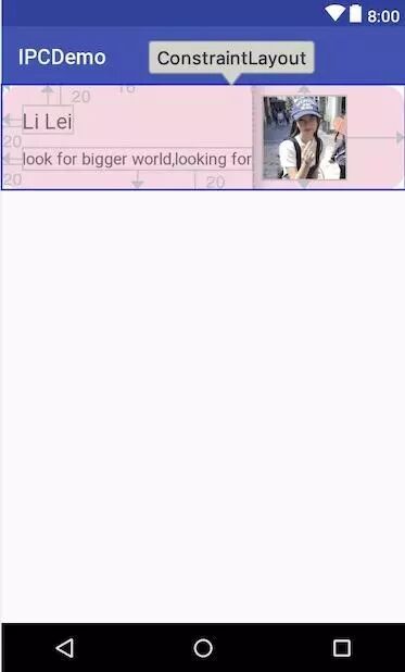 <android.support.constraint.ConstraintLayout xmlns:android="http://schemas.android.com/apk/res/android" xmlns:app="http://schemas.android.com/apk/res-auto" android:layout_width="match_parent" android:layout_height="100dp" android:background="@drawable/shape_bg"> <ImageView android:id="@+id/iv_biu" android:layout_width="80dp" android:layout_height="80dp" android:scaleType="centerCrop" android:src="@drawable/biu" app:layout_constraintBottom_toBottomOf="parent" app:layout_constraintLeft_toRightOf="@+id/barrier" android:layout_marginStart="10dp" app:layout_constraintTop_toTopOf="parent" /> <!-- constraint_referenced_ids包含我们需要包含的组件,以这些组件的某一侧为基准 --> <!-- barrierDirection面向包含的组件 --> <android.support.constraint.Barrier android:id="@+id/barrier" android:layout_width="wrap_content" android:layout_height="match_parent" app:barrierDirection="right" app:constraint_referenced_ids="tv_name,tv_content" /> <TextView android:id="@+id/tv_name" android:layout_width="wrap_content" android:layout_height="wrap_content" app:layout_constraintTop_toTopOf="parent" android:layout_marginTop="20dp" android:layout_marginStart="20dp" app:layout_constraintLeft_toLeftOf="parent" android:text="Li Lei" android:textSize="20sp" /> <TextView android:id="@+id/tv_content" android:layout_width="wrap_content" android:layout_height="wrap_content" android:layout_marginBottom="20dp" android:layout_marginStart="20dp" app:layout_constraintLeft_toLeftOf="parent" android:text="look for bigger world,looking for" android:textSize="16sp" app:layout_constraintBottom_toBottomOf="parent" /></android.support.constraint.ConstraintLayout>