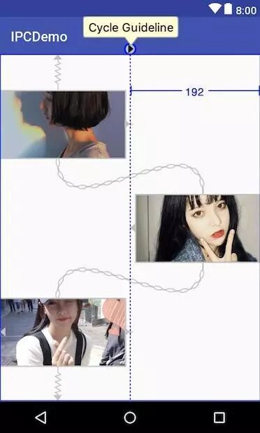 <android.support.constraint.ConstraintLayout xmlns:android="http://schemas.android.com/apk/res/android" xmlns:app="http://schemas.android.com/apk/res-auto" android:layout_width="match_parent" android:layout_height="match_parent"> <ImageView android:id="@+id/iv_beauty" android:layout_width="200dp" android:layout_height="100dp" android:layout_marginEnd="8dp" android:scaleType="centerCrop" android:src="@drawable/beauty" app:layout_constraintBottom_toTopOf="@+id/iv_girl" app:layout_constraintEnd_toStartOf="@+id/guideline" app:layout_constraintLeft_toLeftOf="parent" app:layout_constraintTop_toTopOf="parent" app:layout_constraintVertical_chainStyle="spread" /> <ImageView android:id="@+id/iv_girl" android:layout_width="200dp" android:layout_height="100dp" android:layout_marginStart="8dp" android:scaleType="centerCrop" android:src="@drawable/girl" app:layout_constraintBottom_toTopOf="@+id/iv_biu" app:layout_constraintRight_toRightOf="parent" app:layout_constraintStart_toStartOf="@+id/guideline" app:layout_constraintTop_toBottomOf="@+id/iv_beauty" /> <ImageView android:id="@+id/iv_biu" android:layout_width="200dp" android:layout_height="100dp" android:layout_marginEnd="8dp" android:scaleType="centerCrop" android:src="@drawable/biu" app:layout_constraintBottom_toBottomOf="parent" app:layout_constraintEnd_toStartOf="@+id/guideline" app:layout_constraintLeft_toLeftOf="parent" app:layout_constraintTop_toBottomOf="@+id/iv_girl" /> <!-- Guideline可以设置具体的宽度,也可以设置百分比 --> <android.support.constraint.Guideline android:id="@+id/guideline" android:layout_width="wrap_content" android:layout_height="wrap_content" android:orientation="vertical" app:layout_constraintGuide_percent="0.5" /></android.support.constraint.ConstraintLayout>