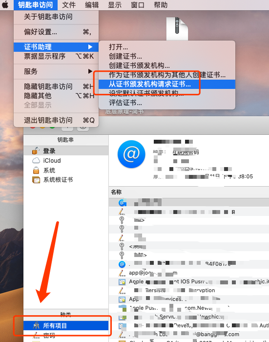 从证书颁发机构请求证书时,钥匙串中最好选择所有项目,要不然创建出来的CSR证书可能会无效。