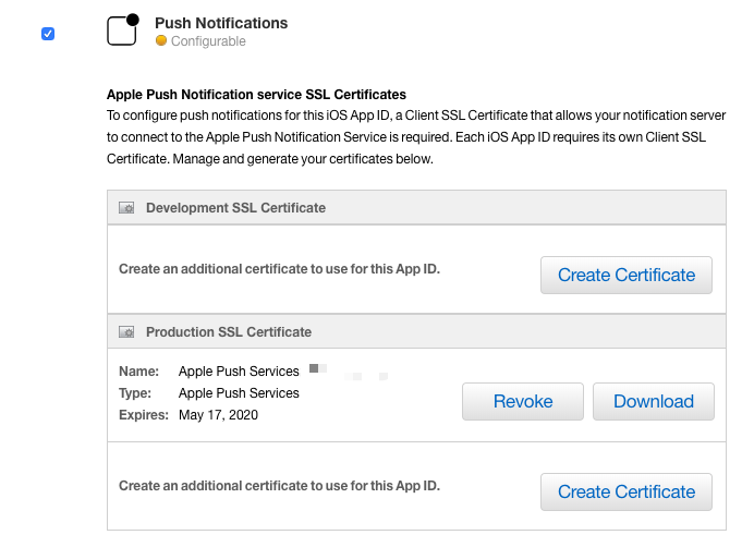这部分是为这个APP ID配置push notifications,一个SSL Certificate可以让你手机上的notification server连接到Apple Push Notification Service(APNS)