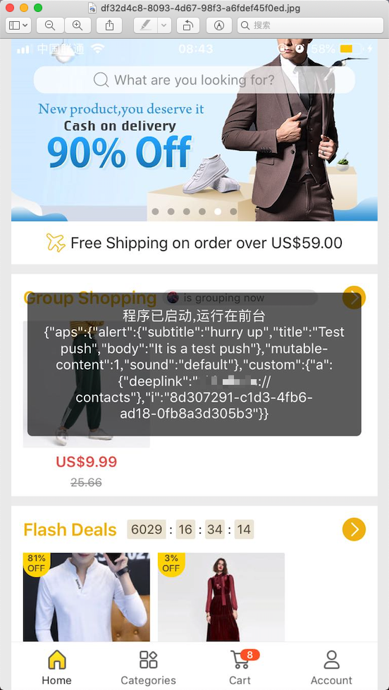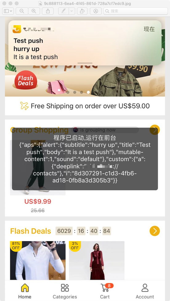 [AlertUtils message:SS(@"程序已启动,运行在前台\n%@", [userInfo JSONString])];