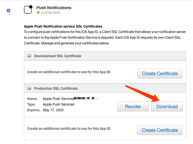 Production SSL Certificate:推送证书配置,线上环境可以收到推送。