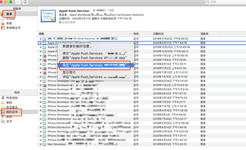 找到自己的APP(后面的名字为当时设定的bundleID),右键导出p12文件,填上密码,保存。