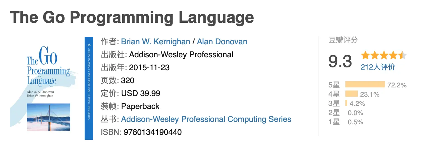 如果说为 Go 语言新手只推荐一本学习教材,那么肯定就是这本号称 Go 语言圣经的 《The Go Programming Language》,豆瓣评分 9.3 分。