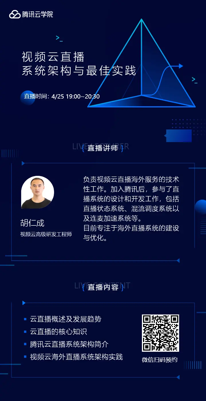近几年,视频直播业务呈爆发态势,逐步发展为当前最热的风口之一。本次直播课程,将邀请到腾讯视频云高级研发工程师胡仁成enson,从技术层面详细讲解腾讯视频云直播系统,并结合直播场景详细阐述在海外视频云直播系统架构中的实践案例。帮助开发者快速梳理云直播核心知识点与视频云场景化架构方案。