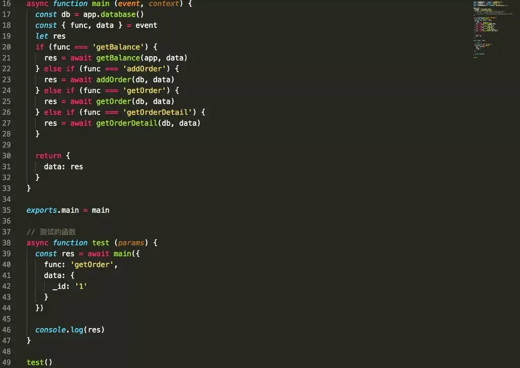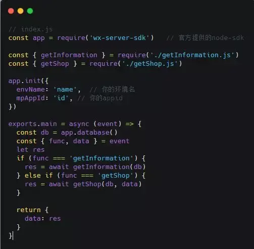 在这个例子中,笔者将一个云函数当成一个模块相关函数的入口,根据函数传入的参数来决定调用哪个函数。而被具体调用的函数,执行的是一些数据的操作,然后返回数据。也就是说,在这个 Demo 里一个云函数是一个数据模块的入口,里面引用了许多待被调用的具体函数,视入参而定。