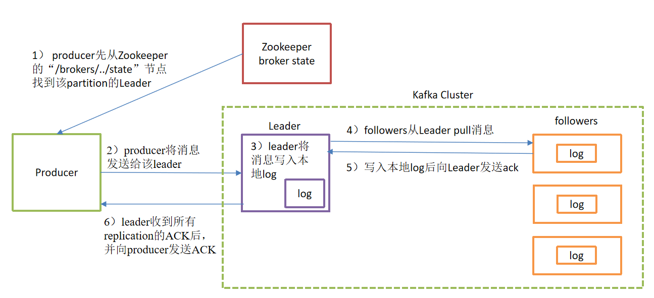 - producer先从zookeeper的 "/brokers/.../state"节点找到该partition的leader