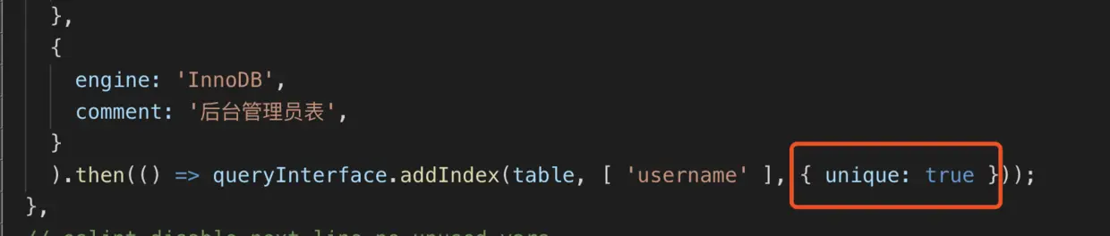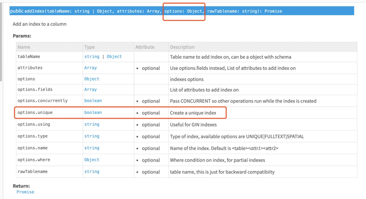 根据上图只需在在queryIterface.addIndex()的第三个参数加上{unique:true}即可。如下图