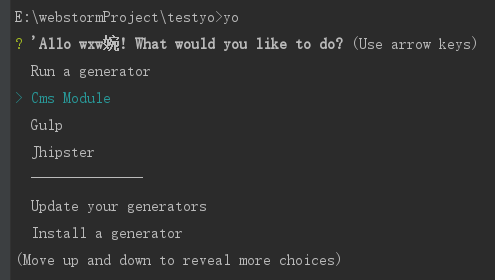 新建新的项目workpalce,执行yo,如果看到Cms Module说明搭建脚手架成功~