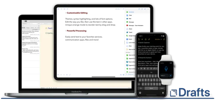 - Drafts (iOS、Mac) :一个草稿应用,主打快速记录,是文字信息的收发站,有许多 Action 可与其他 App 联动。(在我写这篇文章的期间它已经出了 Mac 上的正式版。)