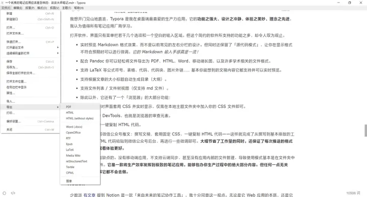 我想指出的是「同步」不只是自己与自己同步,却常常是要与别人「同步」。md 这样一个相对小众的文件格式并不适合分享,因此支持导出其他文件格式也是相对比较重要的。更有甚者连导出本地 md 文件都不支持,这一点的弊端我在后文将提到。