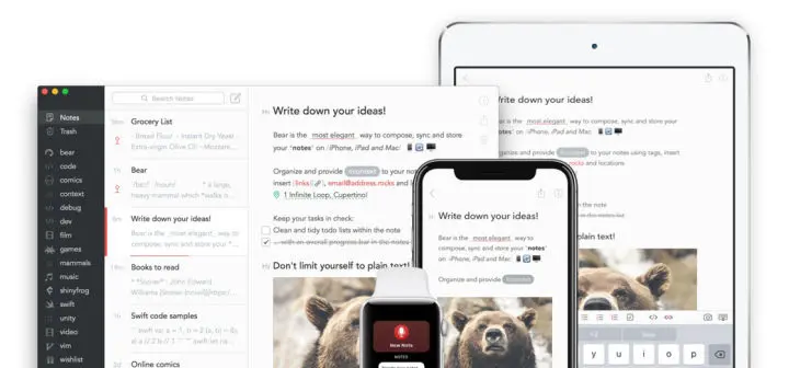 - Bear (iOS、Mac):一个小型笔记应用,主打美观和效率并行,并对 Markdown 语法做了一定的改动。
