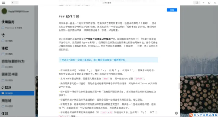 你正在阅读的这篇文章的初稿是我全程在大师笔记中撰写的。期间我和朋友抱怨过:「如果不是要测评这个软件,我真想用 Typora 来写!」我只能说它并没能给我带来比较好的写作体验。这个毛病在比较新的应用上都有所体现,例如 Notion 的写作体验也很糟糕。下面我将一一列举一些让我感到不满的问题(但这不代表你一定会不喜欢它。请下载后亲自尝试一番再做评价!):