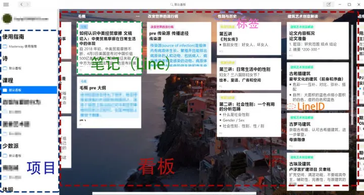 大师笔记希望通过这样的「项目 - 看板 - 标签 - 笔记 - LineId」 系统来管理文档。