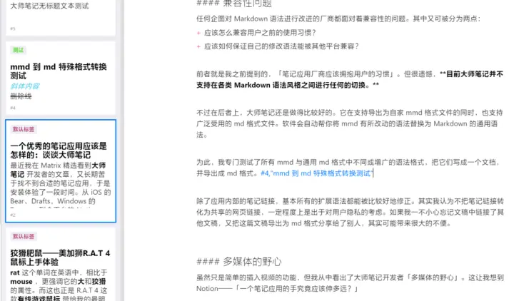 不过在后者上,大师笔记还是做得比较好的。它在支持导出为自家 mmd 格式文件的同时,也支持广泛使用的 md 格式文件。软件会自动帮你将 mmd 有所改动的语法替换为 Markdown 的通用语法。