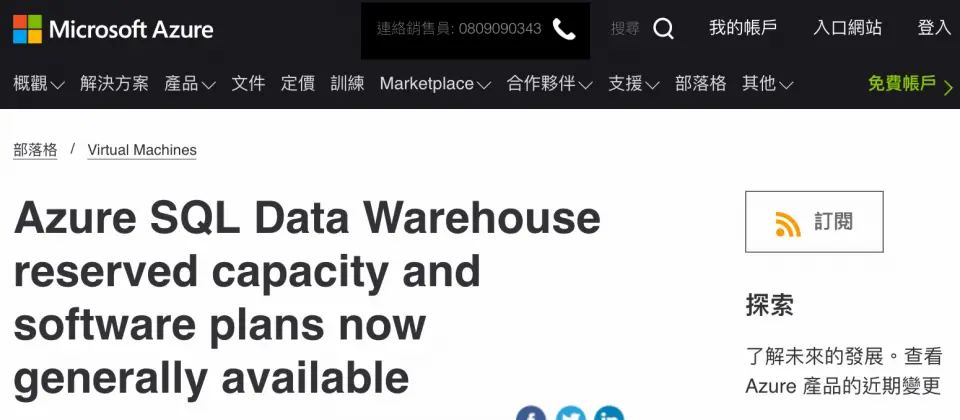 微软现在为Azure SQL数据仓储用户提供更弹性的计价方案,用户可以购买预留容量,并获得比随用随付(Pay-As-You-Go)还要优惠的费率,可以选择保留一年或是三年,最高保留时间三年折扣可达65%,而预留容量必须以100 cDWU(Compute Data Warehouse Units)为购买单位。用户可以在同一个区域的多个仓储使用单个预留容量,当使用量超出预留容量的时候,便依照随用随付定价计费。用户可以灵活地根据需求更改使用地区与期限,或是在符合条件下取消预留容量获得退款。