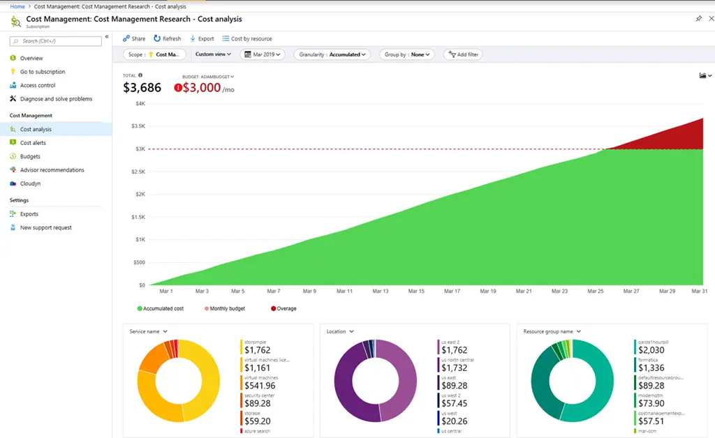 微软开始正式为随用随付以及Azure Government用户提供Azure成本管理服务,能用来分析成本和配置预算,并按排程输出报告,随用随付的用户还能下载CSV档案,以利发票对帐。随用随付以及Azure Government用户现在只要登入Azure Portal,就能看到即日起释出的Azure成本管理服务的正式版功能。用户可以使用成本分析功能(下图),追踪每月的成本,其中提供各式数据分析方法,让用户轻松掌握成本结构。另外,用户也可以使用配置预算功能,主动地管理成本,驱动企业当责制度。