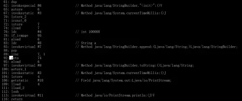 我们可以发现效率确实差距非常的明显。别急,下面我们继续来通过javap命令来查看他的字节码文件指令: