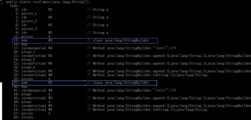 我们可以通过javap命令来查看以上字节码文件的指令如下:我们会发现只帮助我们new了2个StringBuilder对象。我们可以得到如下结论:对于此处的str = str + “a”,编译器会处理为new StringBuilder().append(str).append(“a”),不管一次性+几个字符串,只要+拼接全部在一条语句中,就只会new一次,循环中+拼接被断成了十万条语句,那自然就会new十万次。