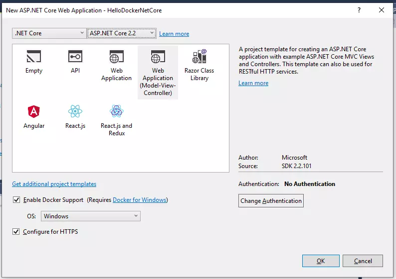 以上我们便完成了对ASP.NET Core应用程序容器化的过程,目前在VS2017中已经集成了对Docker的support,即我们可以在创建project的时候就直接指定当前project需要docker支持,这样创建出来的程序就默认带了Dockerfile文件,如图所示,在创建工程的时候勾选中Enable Docker Support: